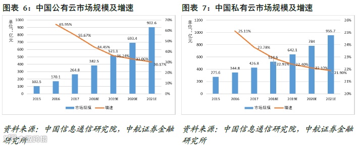 据中国信息通信研究院统计,2017年我国云计算整体市场规模达691.6亿元,同比增长34.32%。其中,公有云市场规模达到264.8亿元,同比增长55.7%,预计2018—2021年仍将保持快速增长态势,到2021年市场规模将达到902.6亿元;私有云市场规模达到426.8亿元,同比增长23.8%,预计未来几年将保持稳定增长,到2021年市场规模将达到955.7亿元。