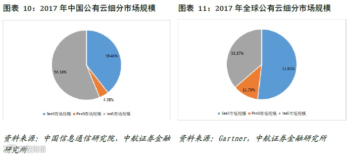 同时,从服务模式来看,我国公有云市场内部也存在着企业级SaaS服务市场占比偏低的问题:2017年,国内IaaS市场成为游戏、视频、移动互联网等领域中小企业IT资源建设的首选,占据了云计算市场56.16%的份额;而由于我国SaaS服务的开放程度不够、易用性不足以及市场环境欠佳,尽管SaaS服务亦在公有云市场规模中占据了一定比例,但是其市场份额主要来自于以云存储等基础服务为主的消费级SaaS市场,企业级SaaS市场仅占SaaS服务市场规模的10%。我国企业级SaaS市场的发展缓慢也是导致了SaaS市场与其上游PaaS市场的规模仅占我国公有云市场的4成,与它们在全球公有云市场中约6成的市场规模形成了对比。同时,从服务模式来看,我国公有云市场内部也存在着企业级SaaS服务市场占比偏低的问题:2017年,国内IaaS市场成为游戏、视频、移动互联网等领域中小企业IT资源建设的首选,占据了云计算市场56.16%的份额;而由于我国SaaS服务的开放程度不够、易用性不足以及市场环境欠佳,尽管SaaS服务亦在公有云市场规模中占据了一定比例,但是其市场份额主要来自于以云存储等基础服务为主的消费级SaaS市场,企业级SaaS市场仅占SaaS服务市场规模的10%。我国企业级SaaS市场的发展缓慢也是导致了SaaS市场与其上游PaaS市场的规模仅占我国公有云市场的4成,与它们在全球公有云市场中约6成的市场规模形成了对比。