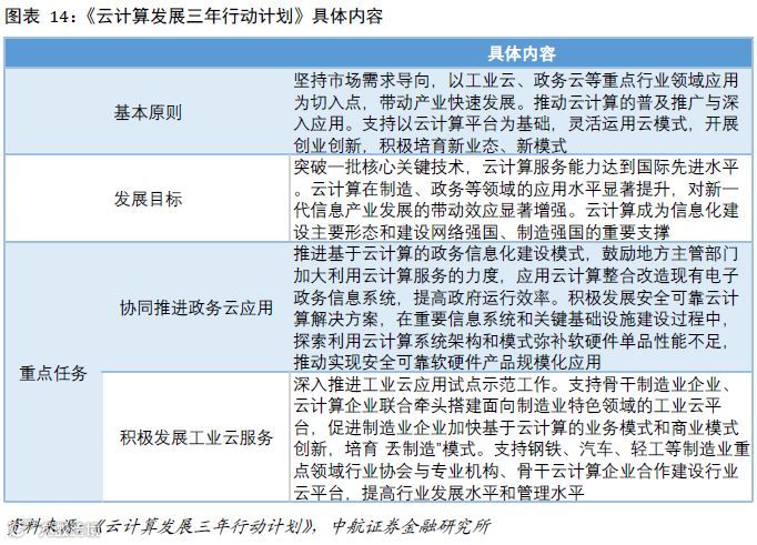 我们认为,《云计算发展三年行动计划》及随后各项政策中以应用促进云计算发展的行动充分表明,我国云计算产业已经度过市场培育以及政府规划时期,迈入了由政府拉动市场需求,促进企业通过市场活动来支持政府宏观规划的政企互动时代。《云计算发展三年行动计划》以政务云、工业云为切入点、开展应用促进行动,将增加用户对于云计算的认知、加速相关标准的建立,为云计算发展创造良好的市场环境。此外,《云计算发展三年行动计划》提出,我国云计算产业规模要从“十二五”末期的1500亿元增长至2019年的4300亿元,复合增长率达30%,彰显了政府对于政务云及工业云的产业带动作用的信心。我们认为,政务云与工业云的潜在需求将被充分释放,未来我国云计算产业高速发展可期。