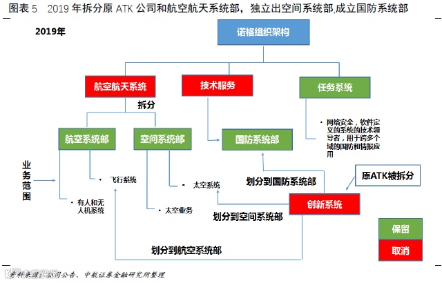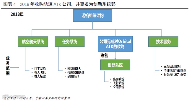 从下面的图表可以看出,诺斯罗普·格鲁曼公司自从2015年开始就开始频繁地进行组织架构调整,最近的一次大动作为2018年6月6日,诺斯罗普·格鲁曼公司斥资92亿美元收购轨道ATK公司,之后将其改名系统创新部并作为四大主力部门之一独立核算。