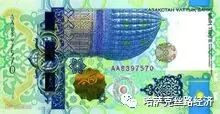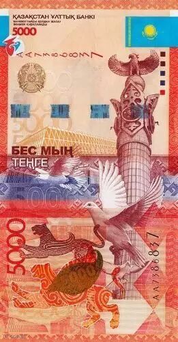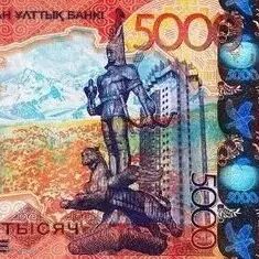 哈萨克斯坦纸钞上第一次出现全息条。主图案为飞翔的和平鸽与代表前首都阿拉木图的标志-苹果。