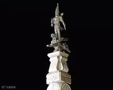哈萨克武士立于插翅的雪豹上——这是哈萨克斯坦独立纪念碑的顶部雕塑。