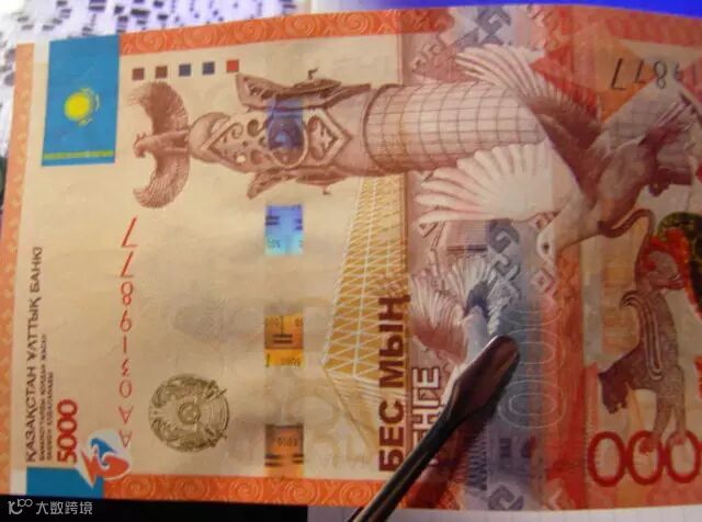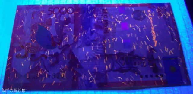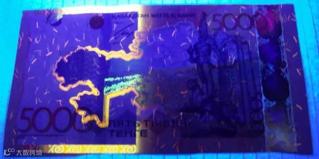 紫光灯下看哈萨克斯坦5000坚戈依旧是如此绚丽,地域轮廓图的边缘呈现出金色效果,熠熠生辉。