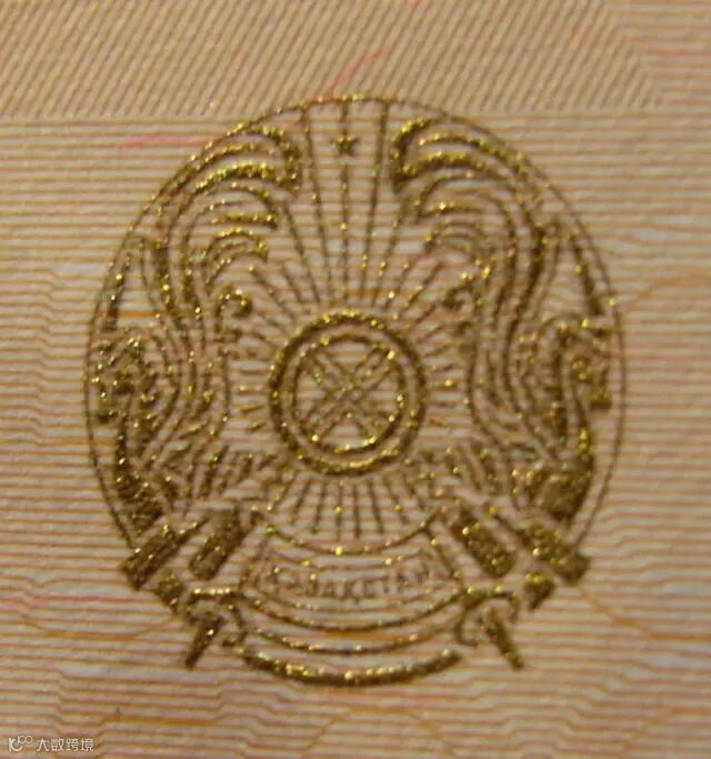 国徽,两侧为骏马,下端的饰带上用哈萨克文写着“哈萨克斯坦”。