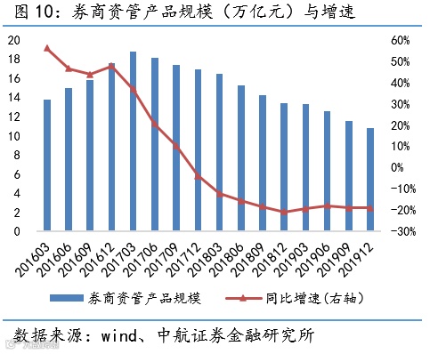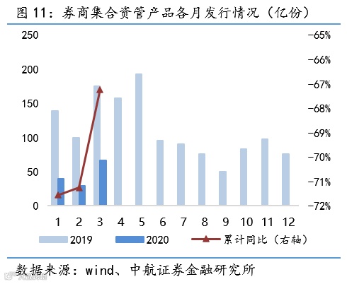 资管:截至2019年末,券商资管规模合计10.83万亿元,同比-18.91%。截至3月末年内券商集合资管产品累计新发行份额135亿份,同比-67.24%。