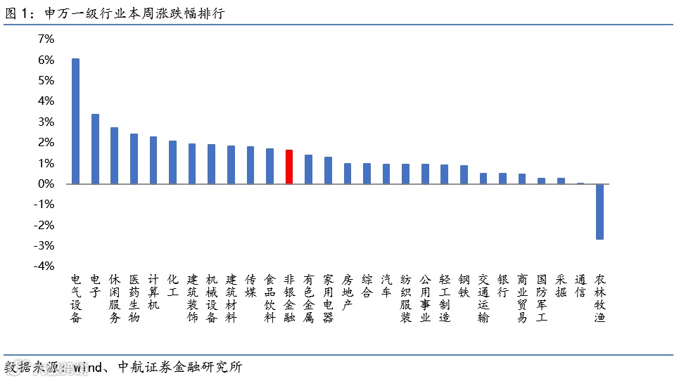 非银板块本周上涨1.64%,涨跌幅在28个申万一级行业中排第12。子板块方面,券商上涨1.20%,保险上涨2.42%,多元金融下跌0.38%。