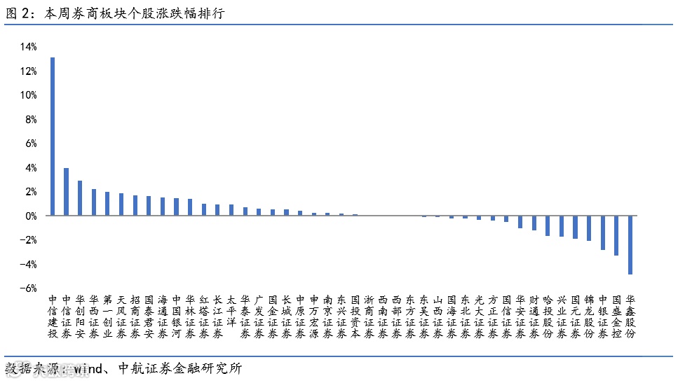 涨幅前三:中信建投(+13.07%)、中信证券(+3.96%)和华创阳安(+2.92%);