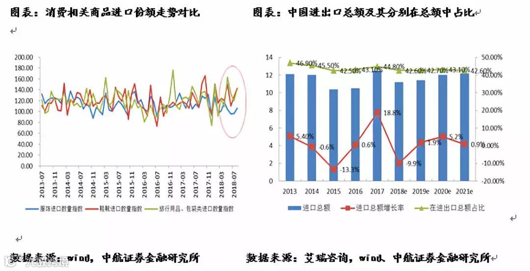 从此次进口博览会展区分布来看,大部分展区都与消费高度相关,这也进一步印证了未来消费品进口比重将会持续提升,并且根据与消费高度相关的各项细分品类近些年进口指数走势来看,从2013年起,进口走势较为平稳,消费相关的三项进口指数从今年七月起均保持向上增长趋势。