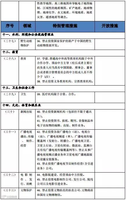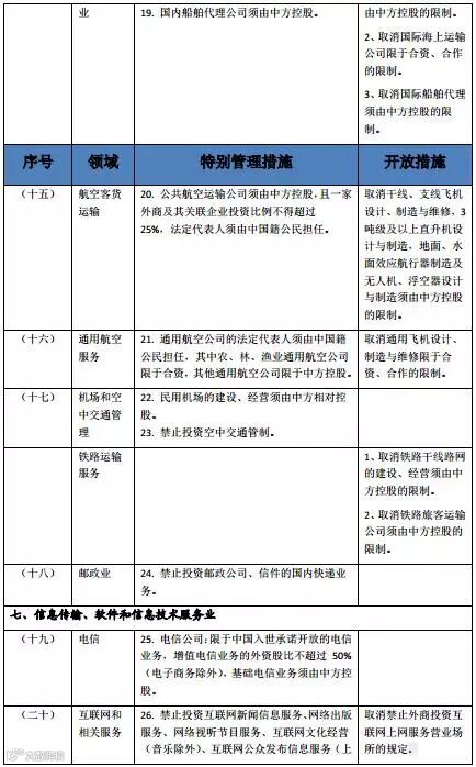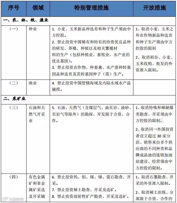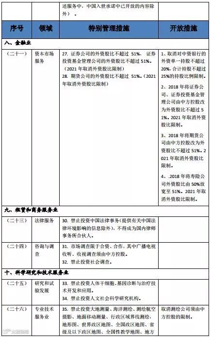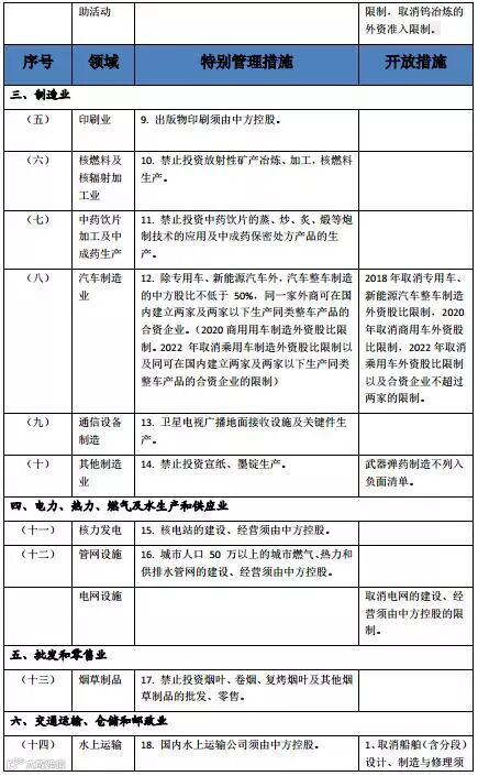 国家发展改革委、商务部于6月28日以第18号令,发布了《外商投资准入特别管理措施(负面清单)(2018年版)》(以下简称2018年版负面清单),自2018年7月28日起施行。《外商投资产业指导目录(2017年修订)》中的外商投资准入特别管理措施(外商投资准入负面清单)同时废止,鼓励外商投资产业目录继续执行。2018年版负面清单,大幅度放宽市场准入,清单长度由63条减至48条,共在22个领域推出开放措施: