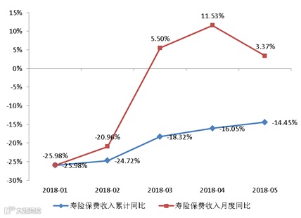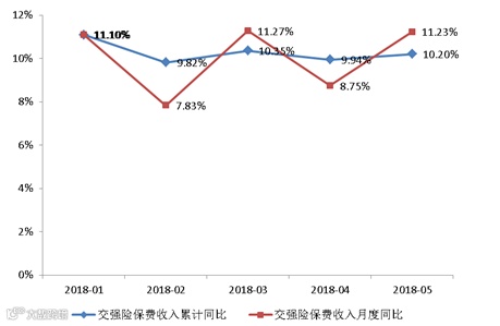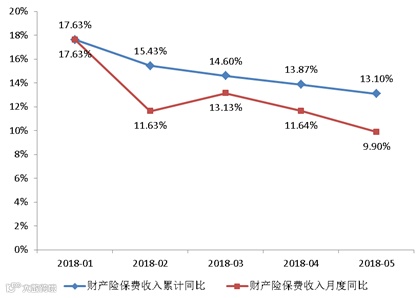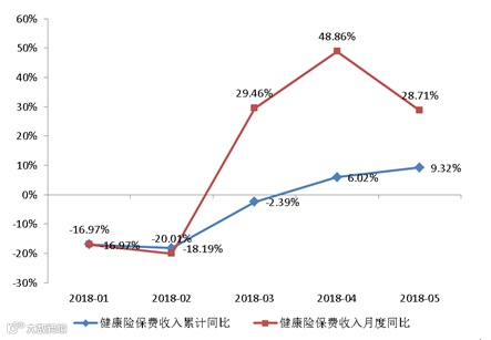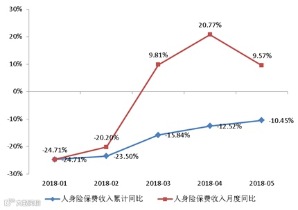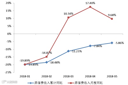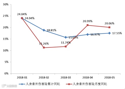 近日,银保监会发布2018年1-5月保险行业统计数据报告。2018年1-5月保险行业累计实现原保费收入19103亿元,同比-5.86%。其中人身险保费累计收入14628亿元,同比-10.45%,财产险保费收入4475亿元,同比+13.10%。人身险中,寿险保费收入11735亿元,同比-14.45%,人身意外伤害险保费收入444亿元,同比+17.55%,健康险保费收入2449亿元,同比+6.32%;财产险中,交强险保费收入821亿元,同比+10.20%,农业险保费收入223亿元,同比+33.86%。2017年下半年以来保监会对人身保险产品开发设计严监管对行业不利影响逐渐被消化吸收,同时健康险、人身意外伤害险等潜在价值在保险回归保障本源的趋势中得到广泛重视,成为新的增长点。农业险在国家乡村振兴战略、精准扶贫、中美贸易摩擦等多重因素共同作用下,迎来重大发展机遇,年初以来持续保持较高增速,在财产险保费结构中的重要性将不断上升。截至5月底,保险行业原保费收入累计同比降幅连续收窄,有望在三季度实现正增长,全年增长预期较强。