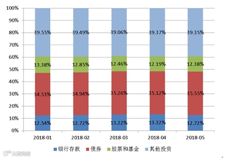 5月末,保险公司资金运用余额155487.46亿元,较年初增长4.21%。其中银行存款19773.93亿元,占比12.72%,较4月份下降0.6个百分点;债券55280.75亿元,占比35.55%,较4月份上升0.4个百分点;股票和证券投资基金19247.04亿元,占比12.38%,较4月份上升0.19个百分点;其他投资61185.74亿元,占比39.35%,较4月份下降0.02个百分点。年初以来,10年期国债收益率从高位回落,结合灵活货币政策预期,预计下半年国债收益率回升是概率较小。另一方面,A股市场经过连续回调,投资价值不断显现,稳步增加权益资产配置是合理选择。综合股债情况,预计保险行业投资端机遇与挑战并存。