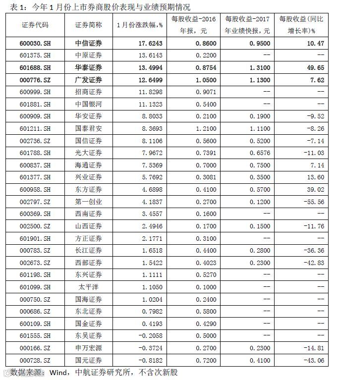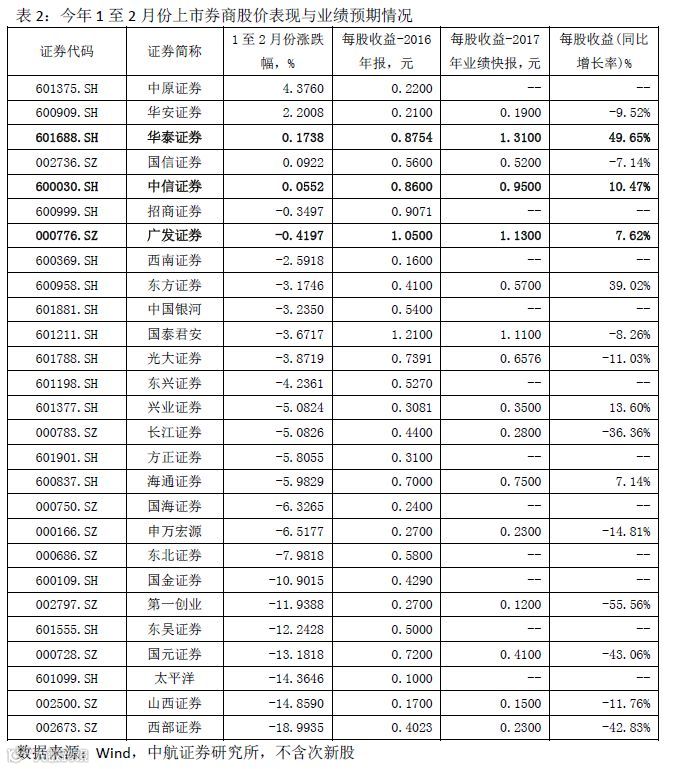 但是,虽然券商板块整体走势不尽如人意,板块内个股走势却呈现分化。行业整体实力排名居前的证券公司,在2017年实现良好业绩预期的支撑下,相较其他上市券商个股取得相对较好的股价表现。(以下讨论不含次新股在内。)以中信证券为例:中信证券在1月份实现17.62%的涨幅,位居1月份上市券商个股涨幅首位,其2017年业绩快报每股收益0.95元,位居已披露业绩快报上市券商每股收益前列,并较2016年每股收益同比上涨10.47%;2月份中信证券股价随大盘整体回落之后,自今年年初至2月28日,股价涨幅0.06%,位居上市券商涨幅第5位,显著优于券商板块整体表现。