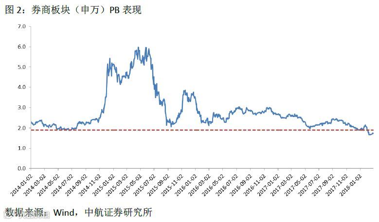今年年初以来截至2月28日,券商板块(申万)指数下跌5.15%,跌幅超过上证综指,在全部板块(申万)指数中间位居中下。证券行业2018年业绩增长前景不明朗是年初以来券商板块走势疲弱的重要诱因之一。今年以来,包括IPO发行速度放缓、股票质押回购业务全面收紧等政策面变化,对证券行业相关业务全年业绩表现带来一定隐忧。同时叠加大资管行业资管新规的预期影响,券商资产管理业务业绩增长面临较大压力。整体而言,截至2月底,证券行业全年业绩增长预期尚未表现出明显乐观迹象。反映到股价走势上,除了券商板块涨跌幅表现不佳外,板块PB倍数也突破历史底线,在2月份创造历史新低。