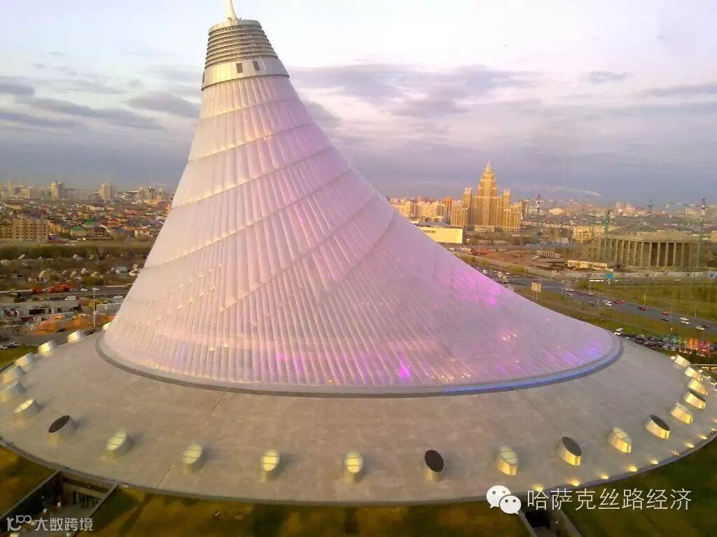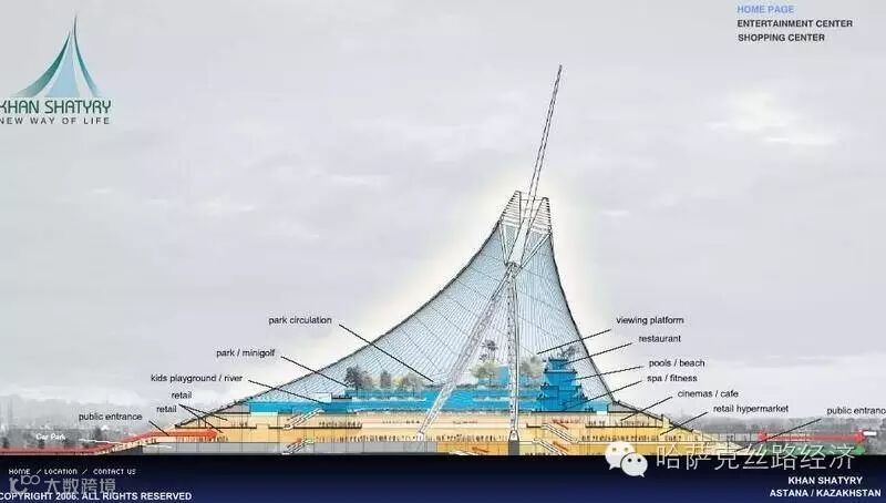 可汗沙特尔由总部设在英国伦敦的福斯特建筑设计 事务所 ( Foster Partners ) 设计,1997年,纳扎尔巴耶夫总统将哈萨克斯坦首都从阿拉木图迁往相对寒冷和偏僻的中北部城市阿斯塔纳(当时称阿克莫拉)。十多年过去了,大帐篷如今成了这座城市新的地标式建筑。这个倾斜的针尖状娱乐中心设计用以唤起人们对哈萨克包的回忆。