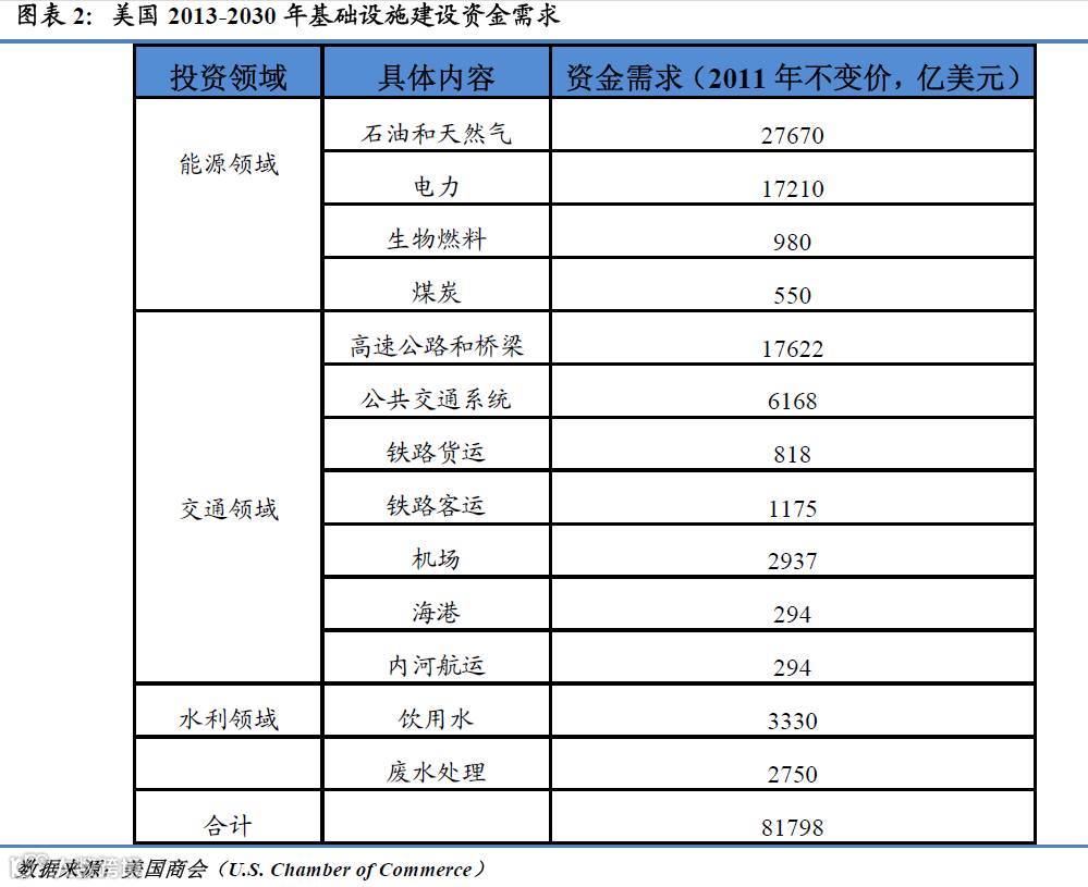 美国在基础设施投资上拥有巨大的潜力和需求。根据美国商会测算,从2013年到2030年,美国的运输、能源以及废水和饮用水基础设施建设至少需要8万亿美元以上的新投资,年均投资额约为4550亿美元。