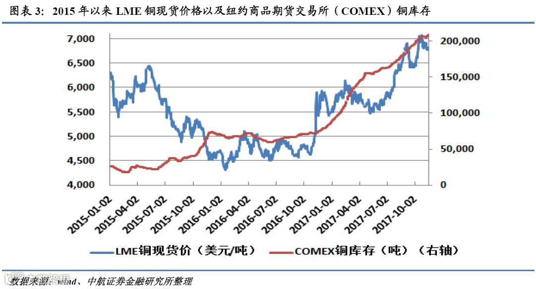 美国巨大的基础设施建设投入将对有色金属产生巨大需求,这将成为助推包括铜在内的大宗有色商品价格的一个有利因素。此前伦敦金属交易所(LME)铜期货现货在2016年年初曾一度下探至4310.40美元/吨,创近7年来最低价,但从2016年年底开始,特别是特朗普赢得美国大选后,LME铜期货现货价格直线上扬,今年10月16日铜价一度上涨至7121.85美元/吨,较2016年年初低点上涨了65.2%,目前LME铜价仍在高位震荡。与此同时纽约商品期货交易所(COMEX)铜库存开始急剧上升,已从2015年3月的1.8万吨稳步上涨到目前的20.8万吨,而且还有继续上涨的趋势。我们认为COMEX铜库存的上涨,主要是美国投资者看好美国未来经济前景而囤积铜,这或许预示着未来铜价仍将会在高位运行。