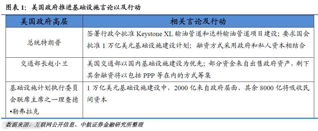 美国政府已经意识到落后的基础设施已经成为其在传统领域和重要的战略新兴领域竞争力下滑的直接原因。此前奥巴马政府多次强调美国的基础设施体系需要重建。自竞选以来,特朗普多次强调,加大基础设施投资建设是 “让美国再次伟大”重要战略支柱。目前基础设施相关进程处在推动过程中,美政府高官基本明确融资将采用政府和私人资本相结合的方式。