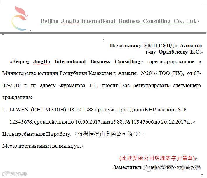 根据哈萨克斯坦移民局的规定,入境5天以上的需要去办理落地签,究竟落地签信函上有哪些信息呢?下面是办理落地签的一封样本信函,从信函上可以看出,提交给移民局的信息如下:
