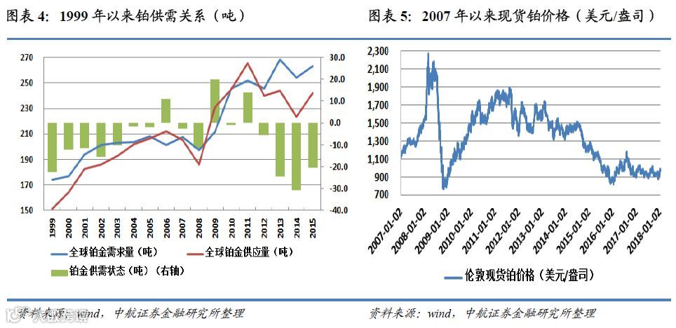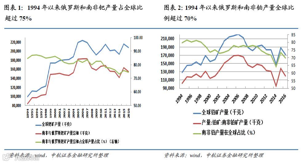 南非和俄罗斯是铂钯市场主要供给国,在上世纪90年代,两者最高一度供应了全世界87.3%的钯、81.34%的铂。虽然进入新世纪以来,两者市场份额虽有所下降,但在2016年两者合计供给了全世界74.52%的钯、69.77%的铂。就铂、钯用途而言,除了用作高档装饰品外,铂、钯还有铑还可充当汽车废气催化剂。