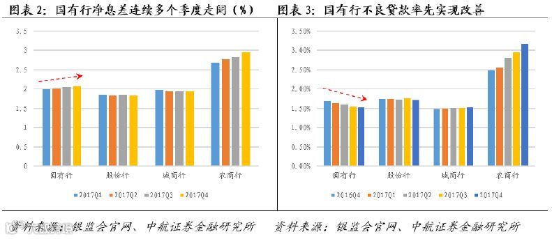 (1)国有行受监管影响较小,净息差有望持续走阔。四季度末,行业净息差为2.10%,连续3个季度小幅走阔。分机构看,国有行和农商行表现较好,环比分别改善2BP/ 12BP至2.07%/2.95%;股份行和城商行净息差较为稳定,环比分别提升-1BP/1BP至1.83%/1.95%。其中,国有行净息差环比已经实现连续3个季度改善,四季末净息差较一季末提升8BP。主要原因在于国有银行渠道资源丰富、资金来源广泛,负债结构中存款占比较高,对同业负债依赖度较小,基本不受央行MPA考核和同业存单备案新规中有关同业负债占总负债比重限制的影响,因此其负债端结构的调整压力明显弱于股份行和城商行,在同业利率维持高位的背景下,国有行能够更好地控制负债端成本,在资产重定价和表外融资需求转表内等因素的影响下,预计2018年国有行资产端收益率仍有望上行,并带动净息差延续上行态势。