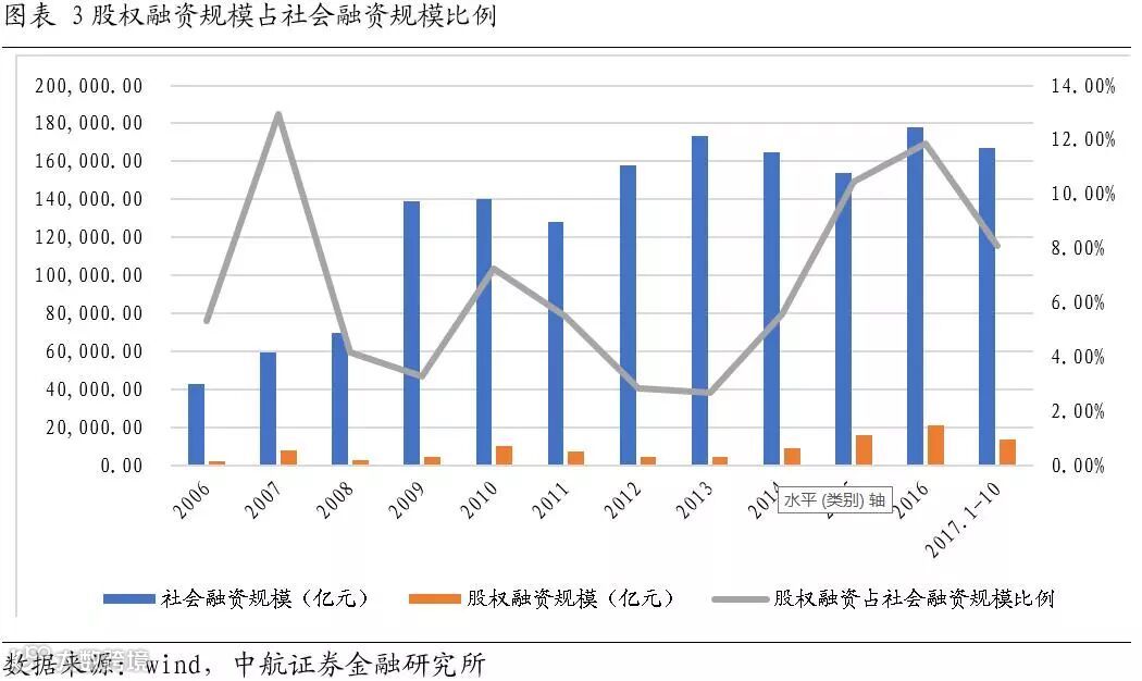 近10年来,股权融资总额占社会融资总额比例有两个最高点:2007年度的12.94%和2016年度的11.87,大多数年份维持在10%一下,受IPO暂停影响,2009、2012、2013三个年度占比最低,在3%左右。