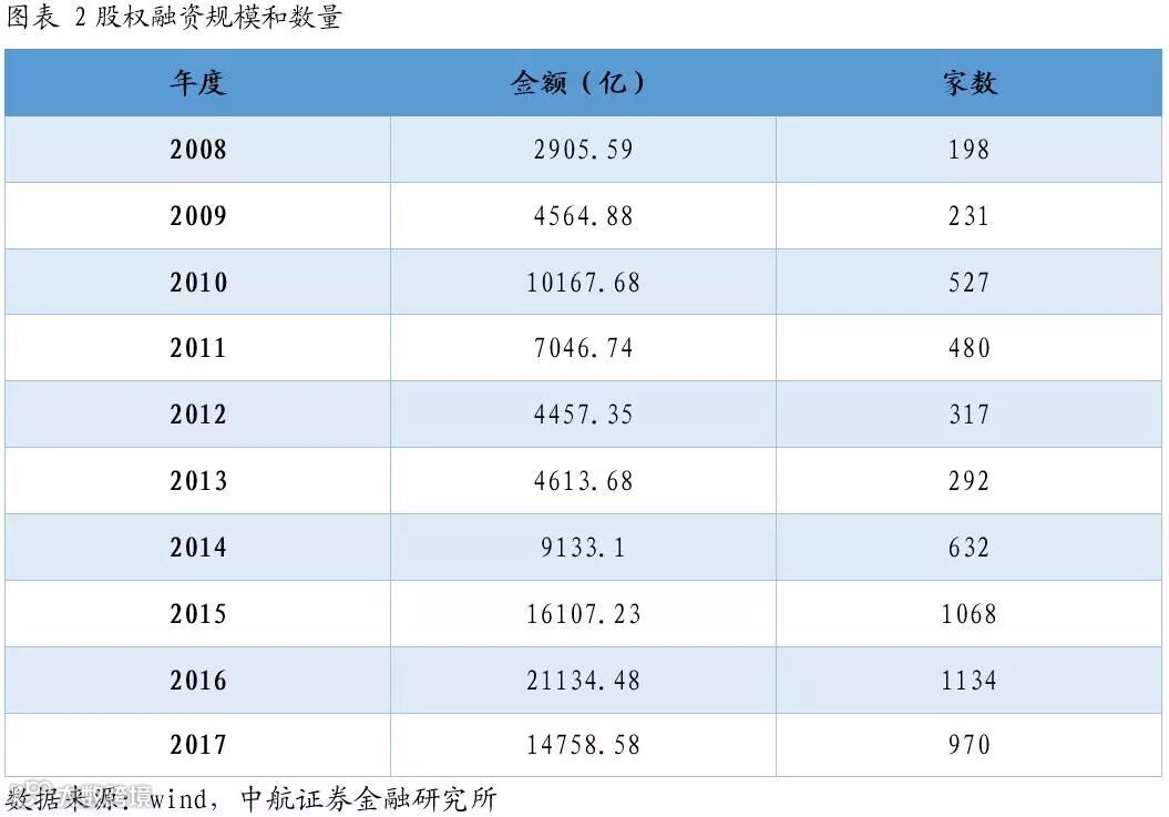 股权融资包括IPO,增发,配股,优先股,可转债,可交换债,私募股权投资等。因私募股权融资数据不便取得,其他类型的总和数据统计如下:
