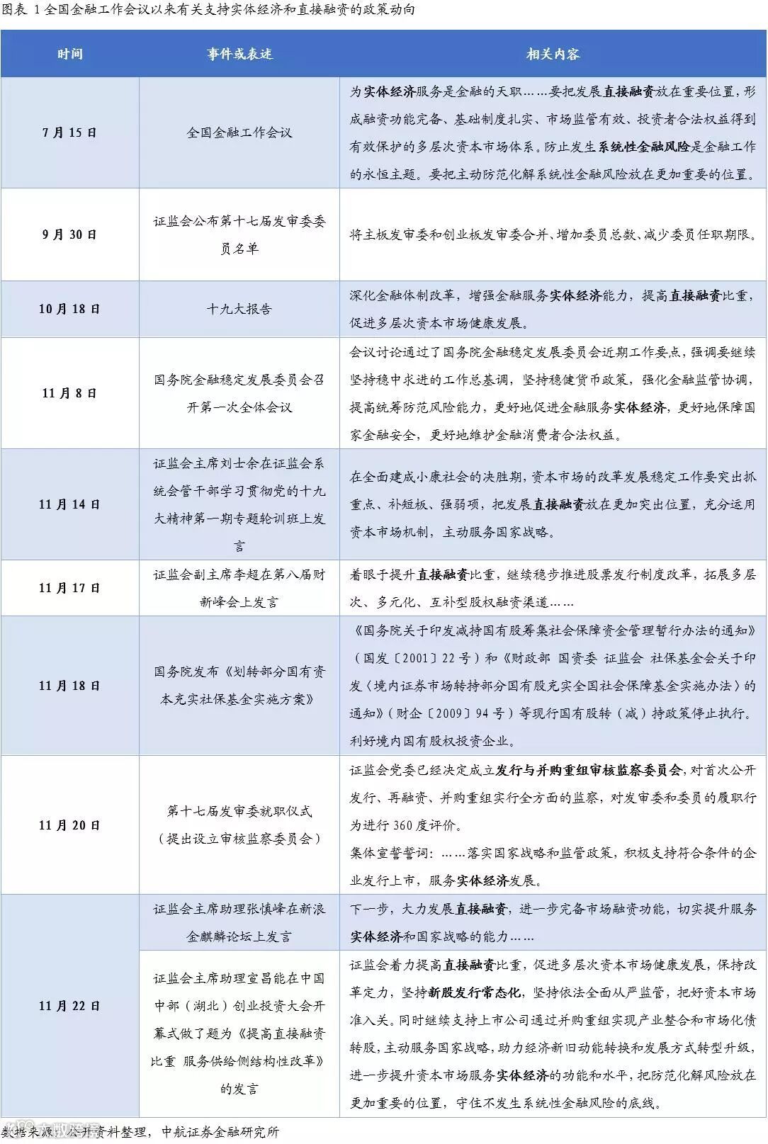 全国金融工作会议以来,金融领域的会议精神及相关监管高层讲话中多次出现三个关键点:提高直接融资比重,服务实体经济,守住不发生系统性金融风险的底线。伴随相关政策导向的提出,国务院金融稳定发展委员会成立,证监会新一届发审委员就职,证监会决定设立审核监察委员会,对政策实施落地做好了监管机构安排。期间,国务院发布《划转部分国有资本充实社保基金实施方案》,取消了国有股IPO划转;“一行三会”、外汇局等部门联合下发的《关于规范金融机构资产管理业务的指导意见(征求意见稿)》,严控资管领域系统性风险。市场注意到,11月14日至22日,短短9天时间,证监会高层在多个场合4次提及提高直接融资比重,释放了重要政策信号。