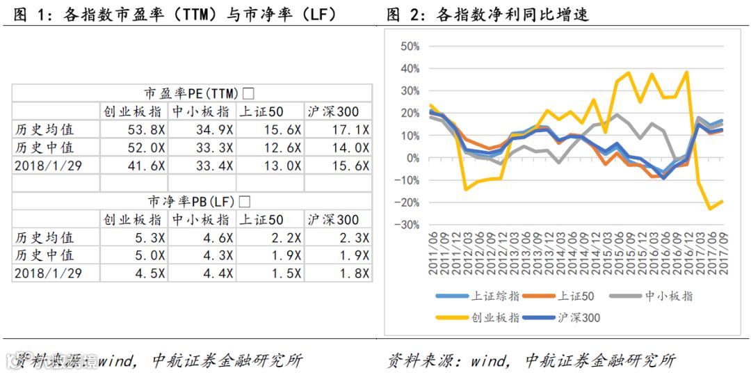 截至2018年1月29日,创业板指市盈率41.6倍,市净率4.5倍,均低于历史均值,但其估值仍然远高于其他指数。尤其是在2017年创业板指整体净利增速大幅下滑的情况下(虽然四季度数据仍然没有全部公布但我们预计创业板指盈利数据仍然差于其他指数),我们认为创业板指的估值不应该套用均值回归模型。