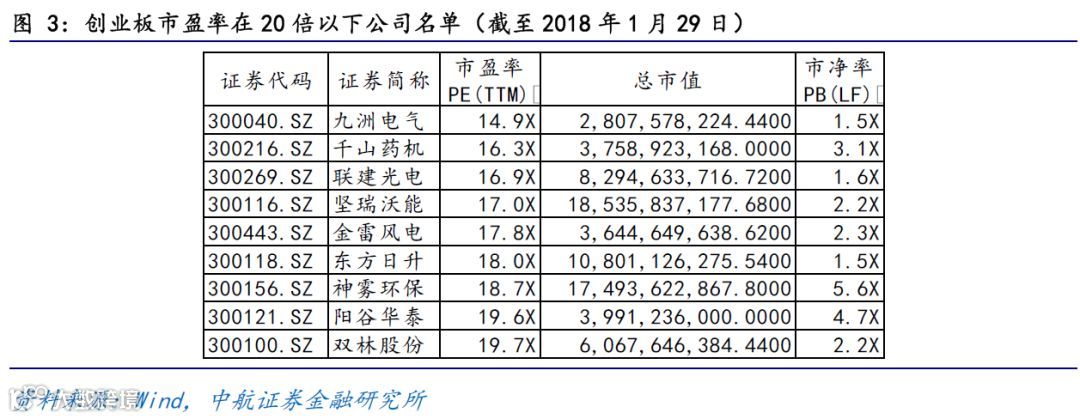创业板当中市盈率在20倍以下的公司仅9家,其中市值在100亿元以上的公司仅3家。并且这9家估值低的公司目前基本面或多或少存在问题。以千山药机为例,公司预计2017年净利亏损1.96亿元-2.00亿元,上年同期实现盈利2.06亿元。