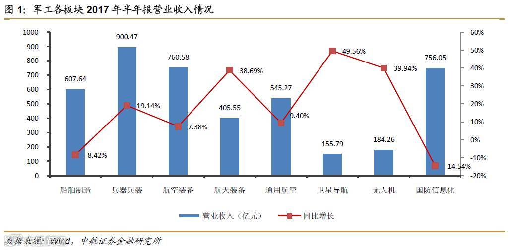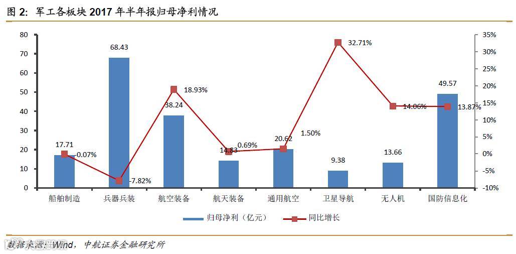 总之,由于军改不断进入尾声以及军品业务的带动,2017年上半年军工行业实现了业绩的稳定增长。我们认为随着周边局势的持续紧张和新型号的列装上量,叠加院所改制、军民融合、混改等改革预期逐步升温的影响,国防军工板块经过前期的大幅调整之后,目前已逐步回升,有望进一步上行。建议重点关注发展机遇大、投资时机好的军用飞机产业链、航天和无人机行业。