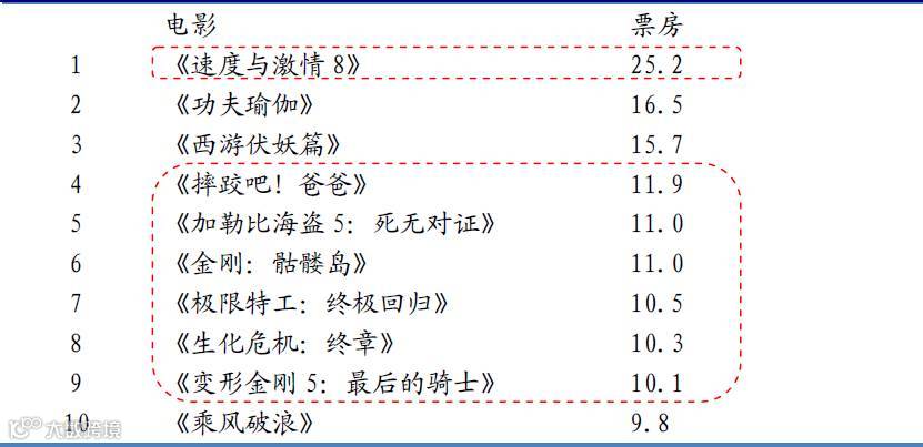 图表 1: 2017年H1内地电影票房排行榜(单位:亿元)(截至6月29日)
