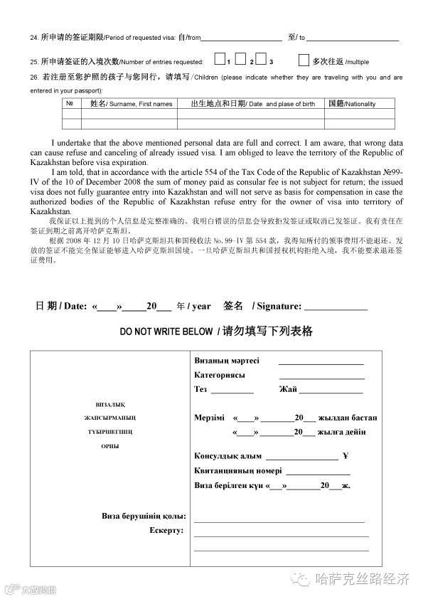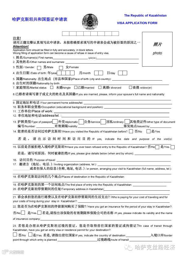 以上是:哈萨克斯坦签证申请表;去过哈萨克斯坦的都知道无论是旅游、商务还是劳务贴签证的时候都需要填写这张表,面试时候递交给签证官。信息需要如实填写,因为邀请函办理时候递交的资料信息已经存档,这个和邀请函的信息是需要一致对应的,面试的时候做好准备,顺签率会高很多。(哈萨克斯坦驻北京大使馆门口,会有中介专门为顾客排号填表,他们会更专业一些,可以咨询他们或委托他们协助办理)