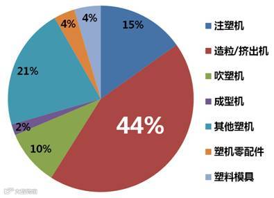 在哈萨克斯塔进口的塑料机械中,主要进口产品为造粒/挤出机,占比达到44%。