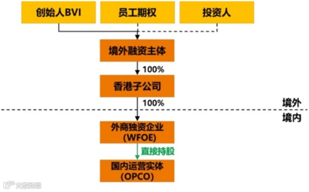离岸公司在境内设立一家外商独资企业(WFOE)。