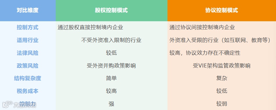 总的来说,股权控制模式通过直接的股权关系来控制中国内地的业务实体,而协议控制模式(VIE模式)则通过一系列合同安排来间接控制业务实体,两者在控制方式、法律结构和财务处理上各有不同。