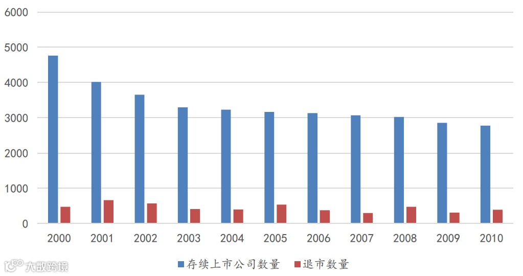 图4:10年间纳斯达克存续上市公司数量及退市数量对比