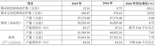 截至2016 年底,圣农发展祖代种鸡的存栏数9.73 万套,较上年下降20.11%,主要系我国对美国和法国等先后实施了祖代鸡引种禁令的影响所致;年底父母代种鸡存栏数476.63 万套,较上年增长29.92%,主要系公司2016 年父母代种鸡淘汰较2015 年下降且2016 年新增父母代种鸡约20%所致;由于公司投资的肉鸡工程及配套工程逐步投产,公司肉鸡的产能、产量继续保持较快增长,2016 年肉鸡的产量达到了37,781.31 万羽,较上年增长7.79%。在肉鸡产量的带动下,公司2016 年的屠宰量及鸡肉产量分别较上年增长7.79%和9.54%,达到37,782.73 万羽和750,502.85 吨。2016 年,公司各生产环节产能利用率较上年均呈现一定程度的上升,其中肉鸡养殖环节的产能利用率小幅下降至84.24%,屠宰环节的产能利用率提升为85.68%。