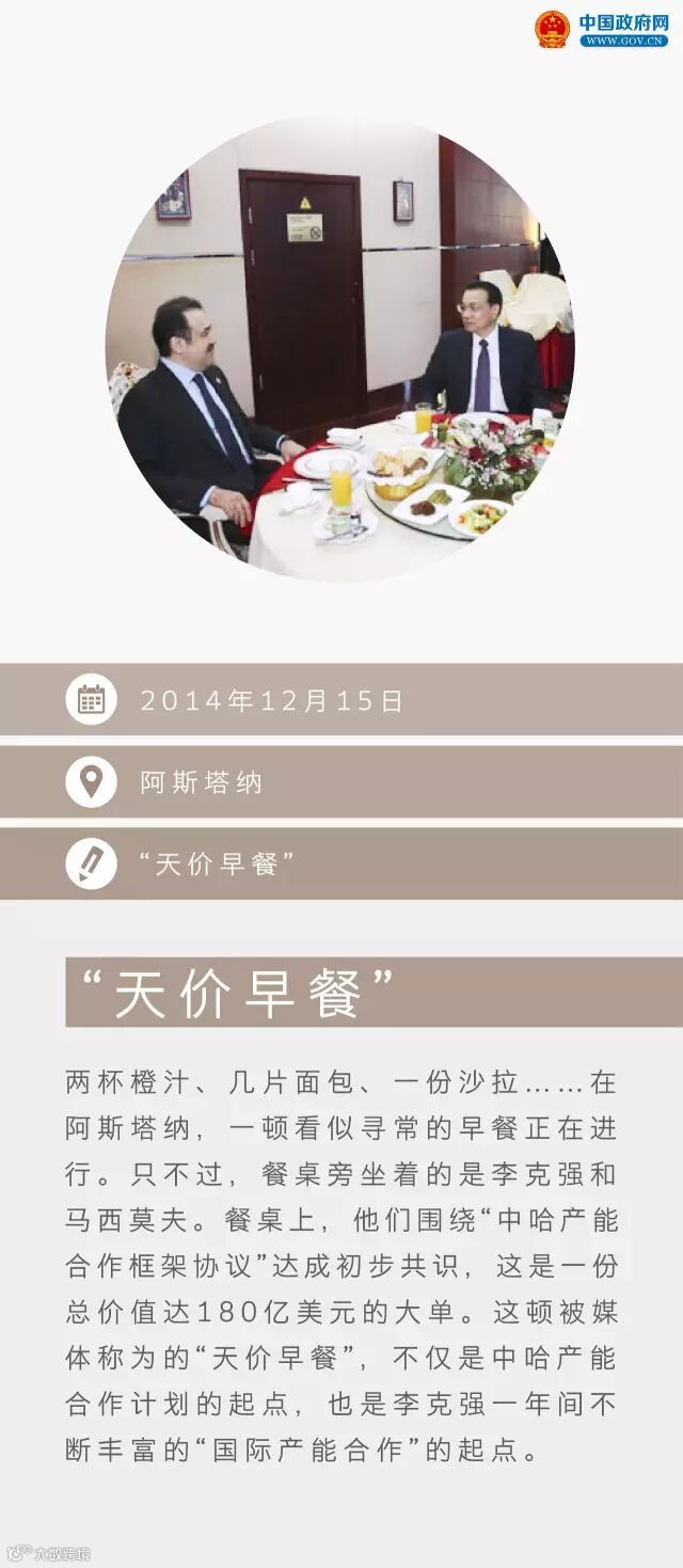 ,从“天价早餐”到“累累硕果”,当李克强总理14日与马西莫夫再次相见时,中哈产能合作已经成为了国际产能合作的典范,并被誉为李克强务实外交的“新名片”。