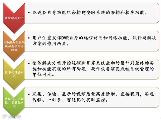 产品进行“网络化、高清化、智能化”升级:以往的旧设备因为受技术所限性能相对落后,清晰度低,施工布线复杂且智能分析功能缺乏,无法满足新形势下高清可视需求,在数字化信息时代,产品更新换代变得迫在眉睫。未来,“智能化”、“网络化”、“高清化”将成为安防产品的主要发展方向,并为整个行业带来新一轮巨大的市场商机。
