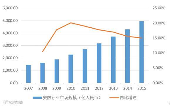 历经十年黄金发展:中国安防产业起步于20世纪80年代初,当时主要应运于特殊领域。经过近20年的原始积累以后,2005年左右开始步入快速发展通道,国内安防行业迎来了10年的黄金发展时间。这一阶段,应用领域迅速扩大,行业参与者数量急剧飙升,市场规模高速增长。截至2015年,我国安防行业的市场规模已经突破4945亿,是2007年同期市场规模的3.4倍,年均复合增速达到15%。