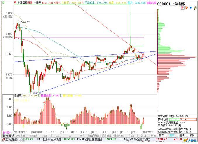 2016年12月26日上证指数达到回探最低点---3068.42点,之后市场开始企稳回升,2017年开门红,已经三连阳,从图1上证指数技术分析图看,前期蓝色的楔形整理通道的下轨支撑有效,且市场已经突破了红色下降通道上轨线的压制,由此我们可以暂时得出结论: