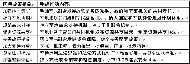 《意见》要求,必须采取有力措施,推动经济建设和国防建设融合发展。四项政策措施在宏观层面,从领导协调、需求共享、政策支持、法规监督四个角度明确了推动军民融合的内容。下半年,具体的军民融合促进政策、运行机制与法律条文有望推出。