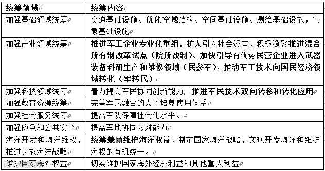 近日,中共中央、国务院、中央军委印发《关于经济建设和国防建设融合发展的意见》,《意见》中提出了军民融合的指导思想、主要目标、基本原则、八个统筹领域和四项政策措施。明确了新形势下军民融合发展的总体思路、重点任务、政策措施,是统筹推进经济建设和国防建设的纲领性文件。
