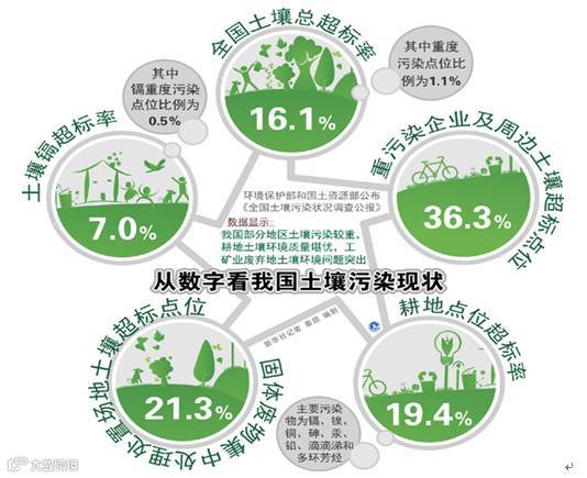 2005年4月至2013年12月,环境保护部会同国土资源部开展了首次全国土壤污染状况调查。调查的范围是除香港、澳门特别行政区和台湾省以外的陆地国土,调查点位覆盖全部耕地,部分林地、草地、未利用地和建设用地,实际调查面积约630万平方公里。调查采用统一的方法、标准,基本掌握了全国土壤环境总体状况。 据2014 年4 月环保部发布的《全国土壤污染状况调查公报》显示,全国土壤总的点位超标率为16.1%,其中轻微、轻度、中度和重度污染点位比例分别为11.2%、2.3%、1.5%和1.1%。全国土壤环境状况总体不容乐观,部分地区土壤污染较重,耕地土壤环境质量堪忧,工矿业废弃地土壤环境问题突出。由此可见,我国的土壤污染问题整体情况不容乐观。