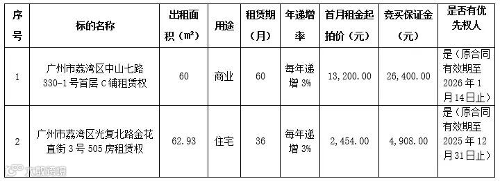 ②标的租金递增及装修免租期说明:上述标的第一年租金按拍卖成交月租金价进行折算,租金从第二年开始逐年递增3%;拍卖成交后,上述标的委托方给予新租赁人30天装修免租期(原租赁人不设装修免租期),在装修前,租赁权买受人应将装修方案报委托方,经委托方审核同意后方可开始装修。