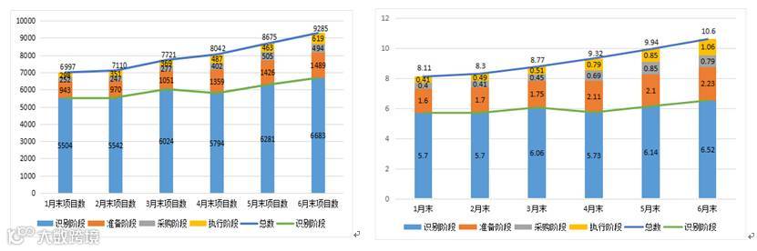 我们在从项目库的总体上看,截至6月末,我国PPP项目库项目总数达到9,285个,总投资额10.6万亿元,比3月末增加1,564个、1.8万亿元;其中已进入执行阶段项目619个,总投资额1万亿元,比3月末增加250个、0.5万亿元。执行阶段项目1月末298个,3月末369个,6月末达到了619个。一季度后两个月比1月末新增71个落地,增长23.8%,二季度比一季度新增250个落地,增长67.7%,增速大幅提高,表明入库项目正在加速落地。1、3、6月末落地率分别为20%、21.7%、23.8%,呈现稳步提升特征。从今年1月到6月,项目库入库项目呈逐月增加趋势,表明我国对于PPP项目的整体需求在不断加大,虽然近七成项目仍属于识别阶段,但6月末已签约进入执行阶段的项目数共619个、落地项目投资额达到1万亿元,可见PPP项目正成为保持经济平稳发展的重要力量。
