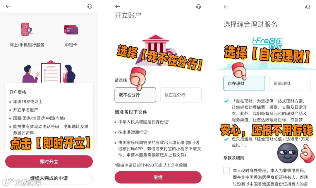 即时开立——选择「我不在分行」——选择综合理财服务类型,例如「自在理财」(页面上有提示需要维持1万港币以上,但开户过程中没有要求存入)。