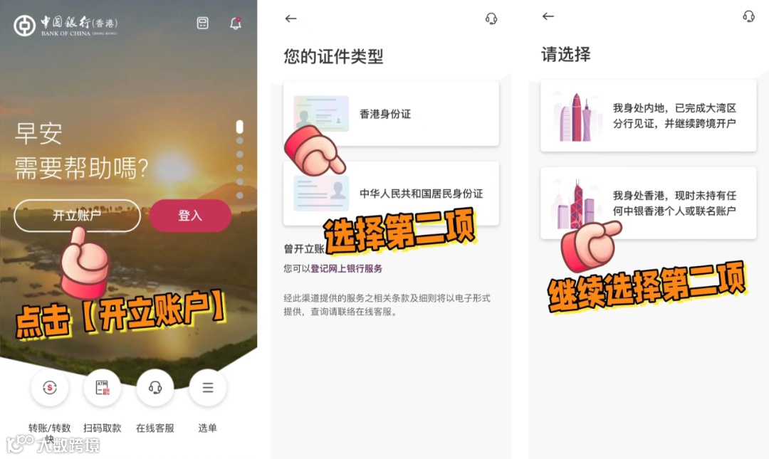 打开app——点击「开立账户」——内地居民证件类型选身份证——身处香港。