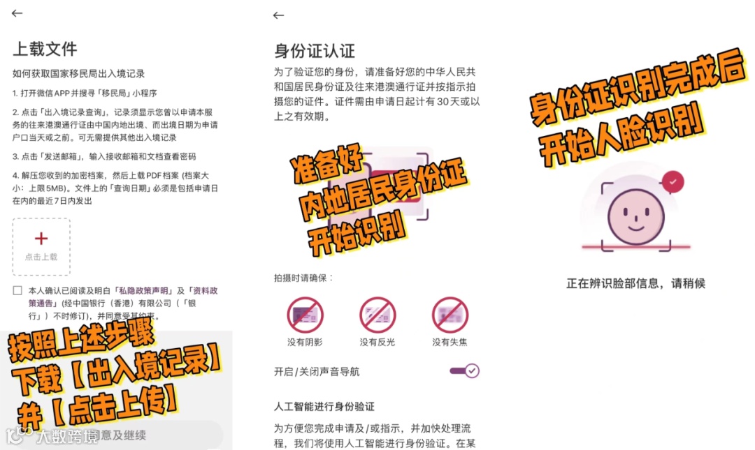 2、开立账户,上传资料(身份证、港澳通行证),人脸识别