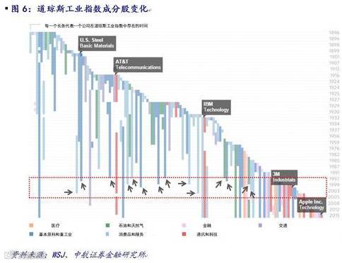 以美国道琼斯工业指数为例,道指是世界上最古老也是最被广泛使用的股票指数之一。它跟踪美国最大的三十家蓝筹公司的股价波动情况,因此道指成分股构成的变化不仅仅反映个体公司的兴衰,更是旧产业没落而被剔除,新产业兴起而被纳入的缩影。从1997年到2005年,道指结构发生了重大调整。在这八年时间中道指的名录上有14家企业被新企业替代:基本原料和重工业、石油天然气、消费品和服务以及交通逐渐让位于金融、医疗以及通讯和科技。这一调整见证了新旧支柱行业的交替,见证了微软、英特尔、思科和辉瑞等公司的腾飞。从1990年到1997年,微软的股价由每股0.44美元增长至每股7.15美元,回报率达到1508%;英特尔的股价由每股0.86美元增长至每股11.61美元,回报率达到1245%;思科的股价由每股0.07美元增长至每股6.21美元,回报率达到8664%等。